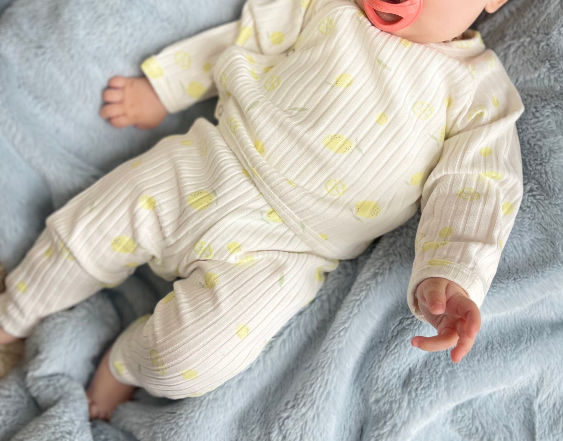 Sou um conjunto composto por camisola de trespasse e calças, confecionado com 97% algodão orgânico e 3% elastano, oferecendo um toque ultra-suave, respirável e com a elasticidade ideal para o conforto do bebé.