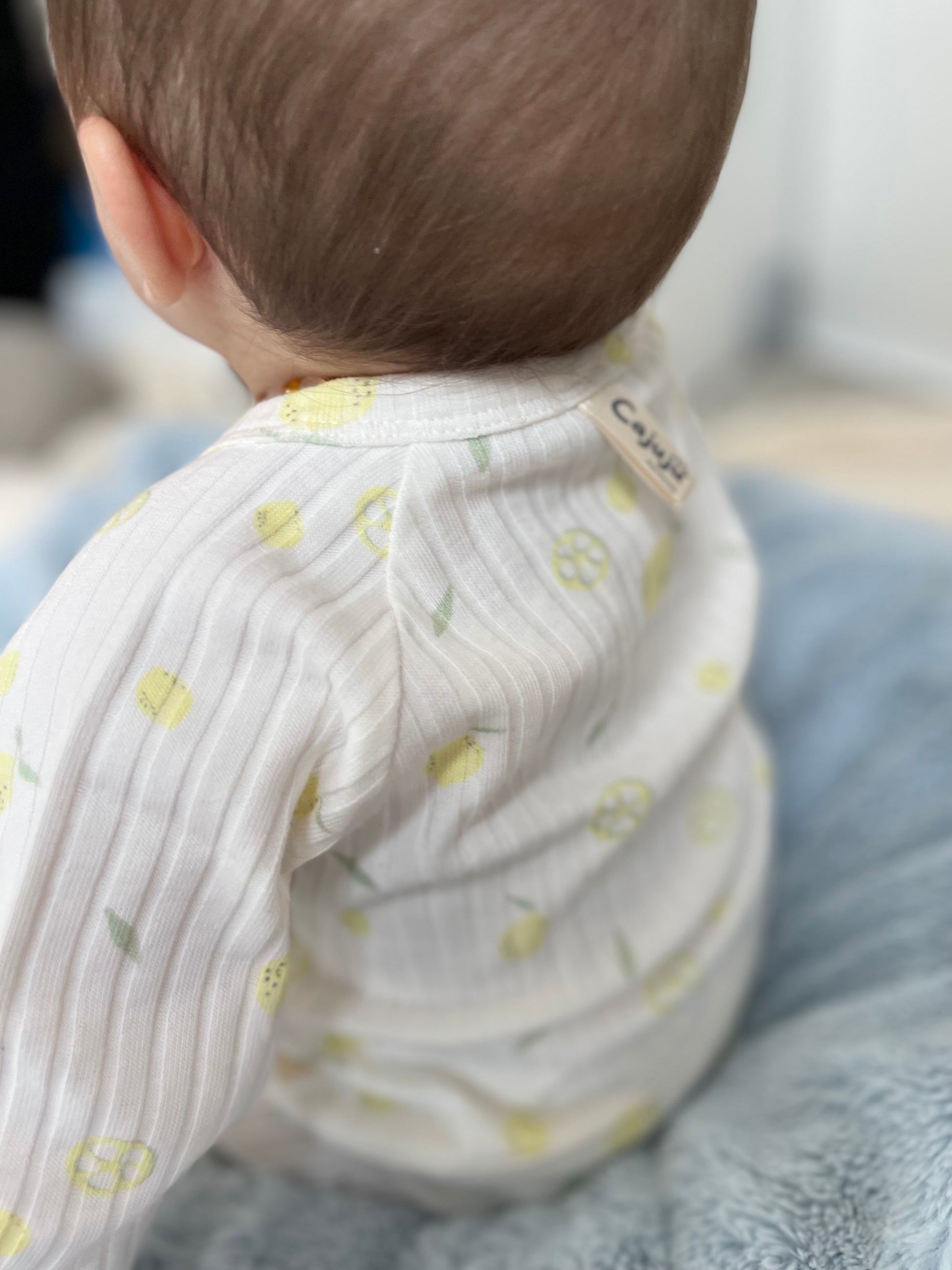 A camisola de trespasse evita a necessidade de passar pela cabeça, tornando o momento de vestir mais prático e confortável. Fecha com molas de pressão, ajustando-se com segurança e delicadeza ao corpo do bebé.